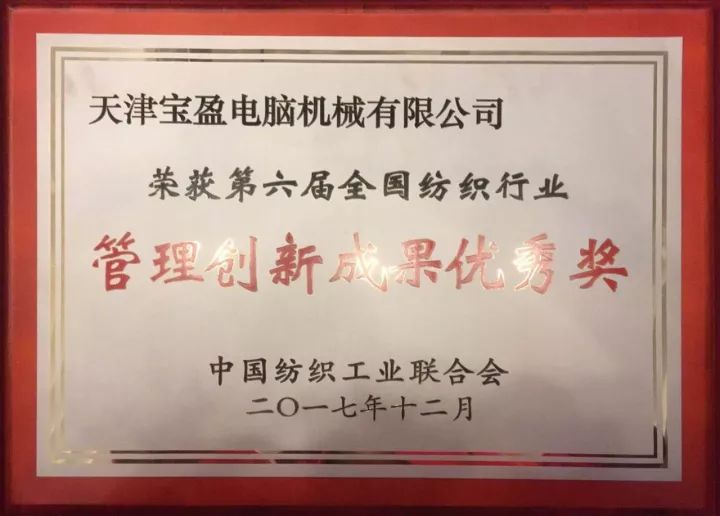 天津宝盈电脑机械有限公司荣获“第六届全国纺织行业管理创新成果优秀奖”。王俊玲总经理,获得“管理创新成果主创者”称号。
